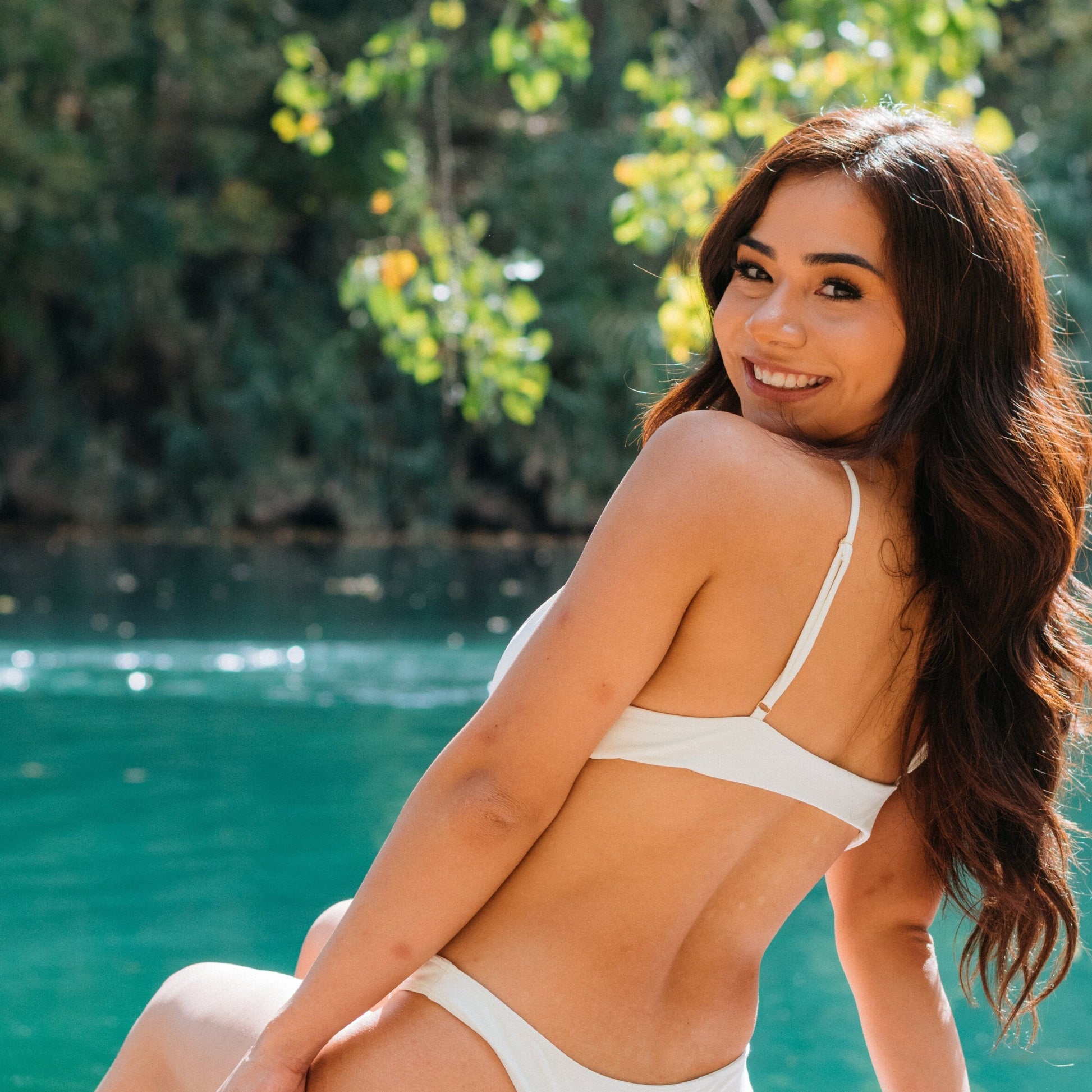 This top is a classic triangle top with a small knot in the middle. This top has a little less coverage than our All Tied Up top, but still provides you with a comfortable amount of coverage. This style has adjustable straps with no clasps or ties on the back. Just like the rest of our suits, this top is made from ECONYL, which is created from recycled fishing nets and industrial plastics that are found in the ocean.